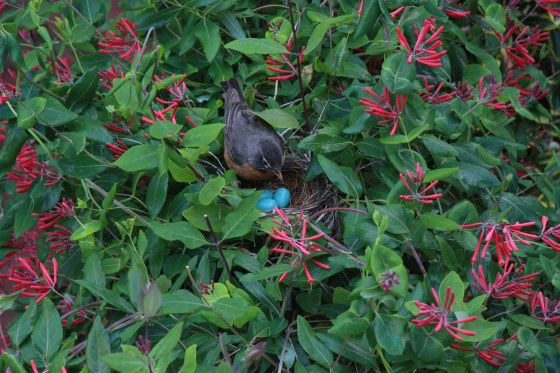 For the past week, I’ve been fascinated by a robin who has taken up residence on top of the honeysuckle … More
